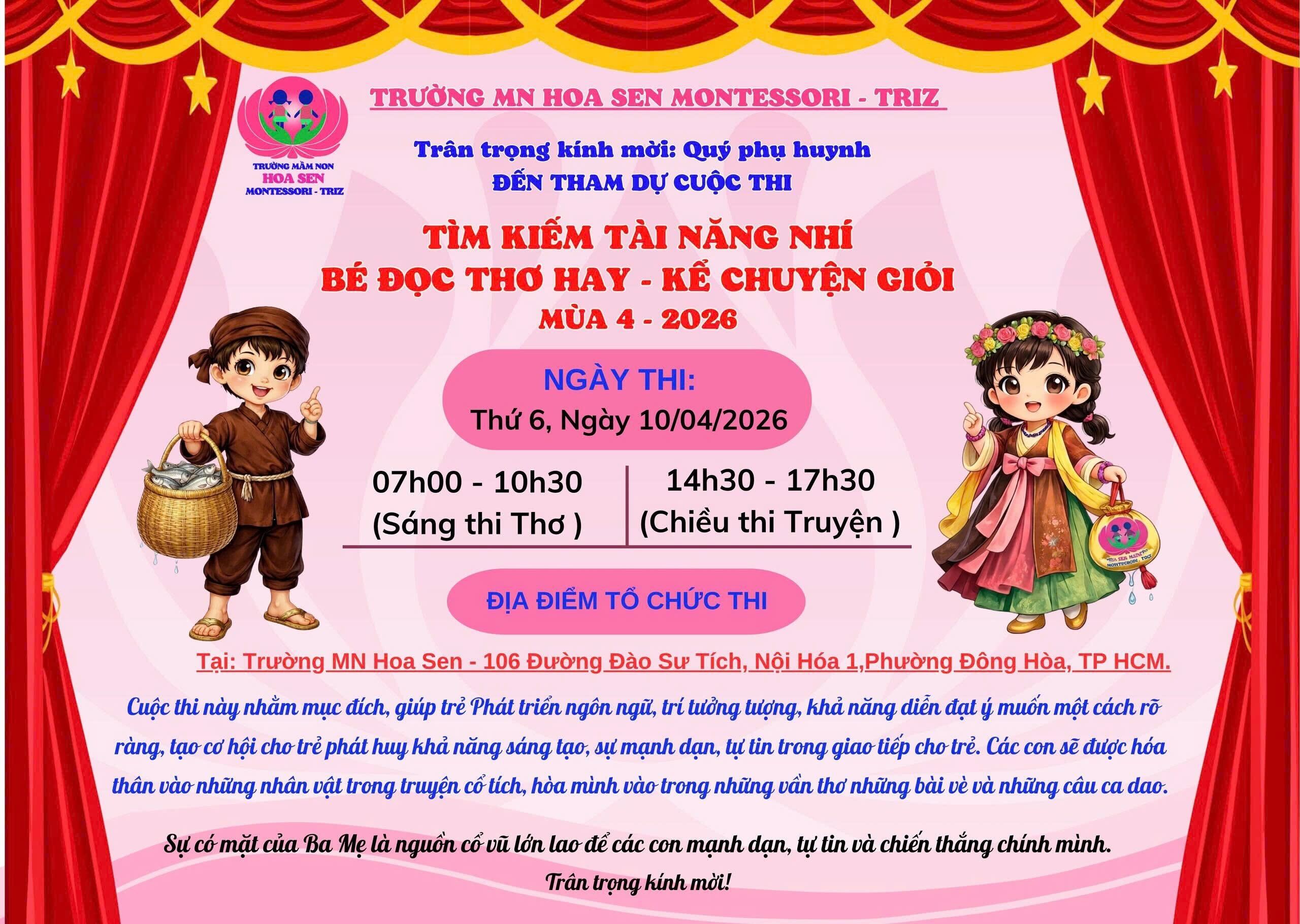🎤✨ BAN GIÁM KHẢO ĐẶC BIỆT – CUỘC THI BÉ ĐỌC THƠ HAY, KỂ CHUYỆN GIỎI 2026 ✨🎤 📣 Tại cuộc thi “Tìm kiếm Tài năng nhí – Bé đọc thơ hay, Kể chuyện giỏi”, Trường Mầm non Hoa Sen Montessori – Triz vô cùng [...]