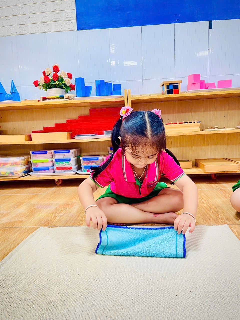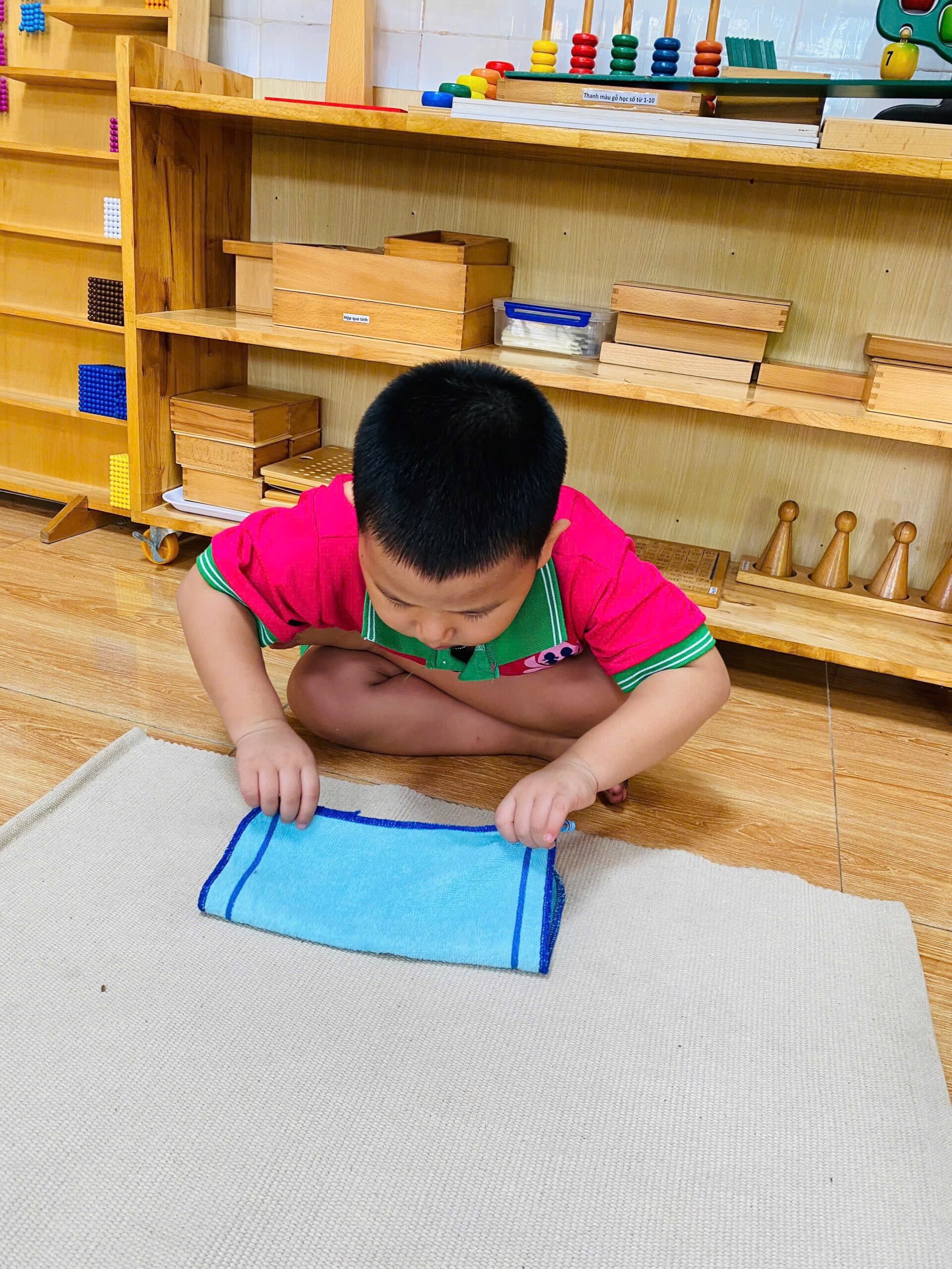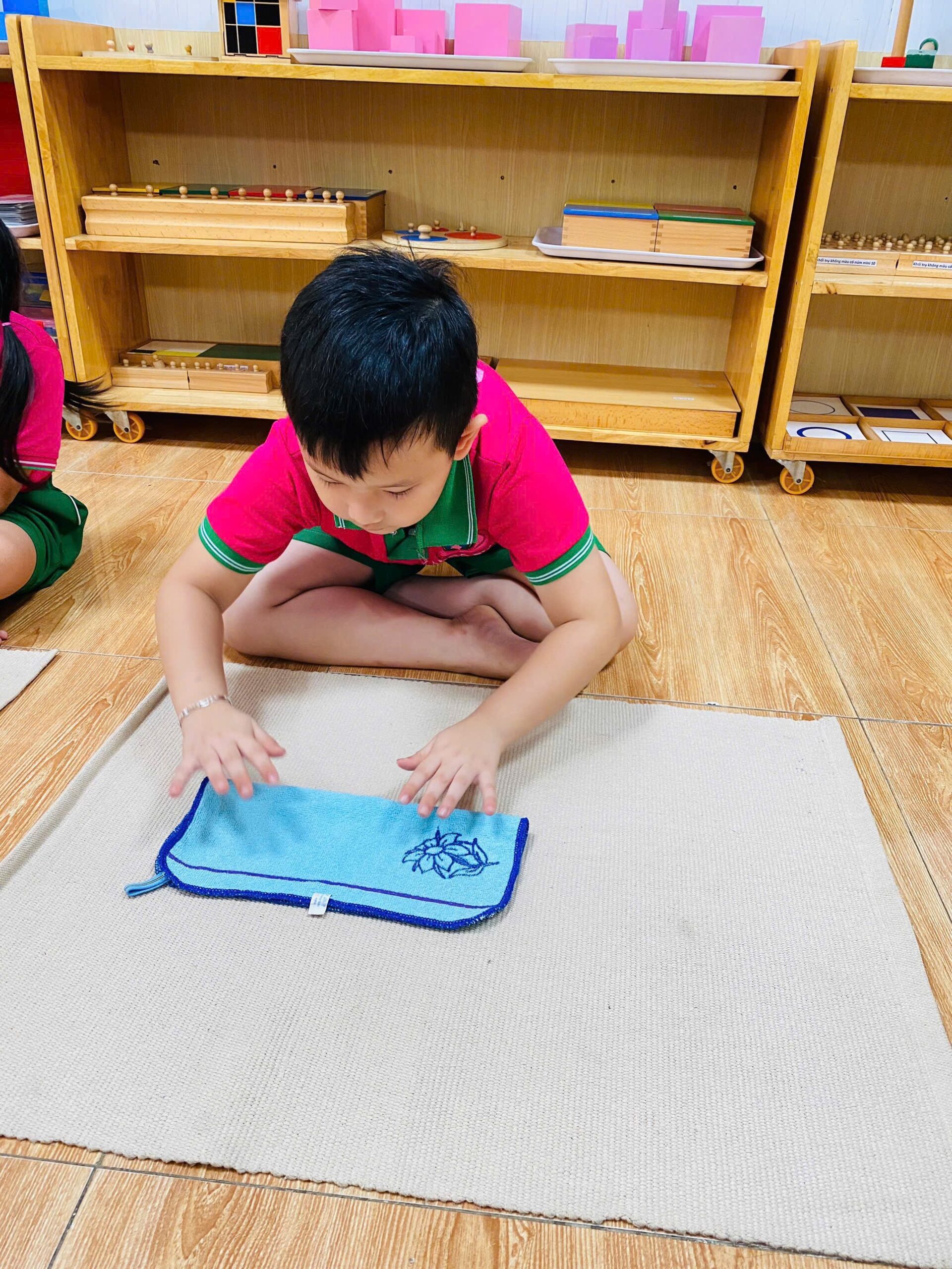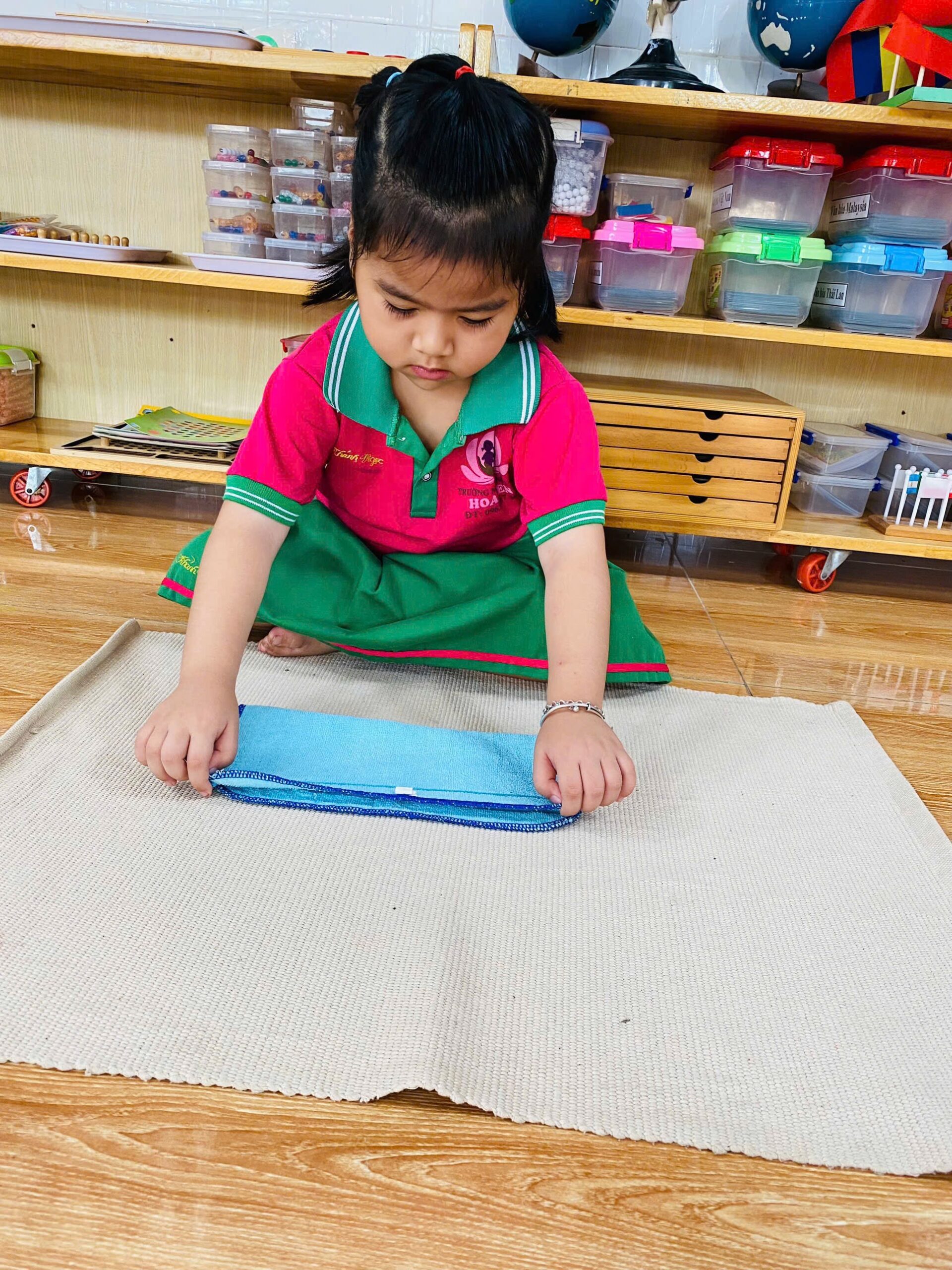 Hôm nay, các bạn nhỏ được trải nghiệm một hoạt động vô cùng thú vị trong tiết học Montessori – kỹ năng trải và gấp khăn 🧺✨