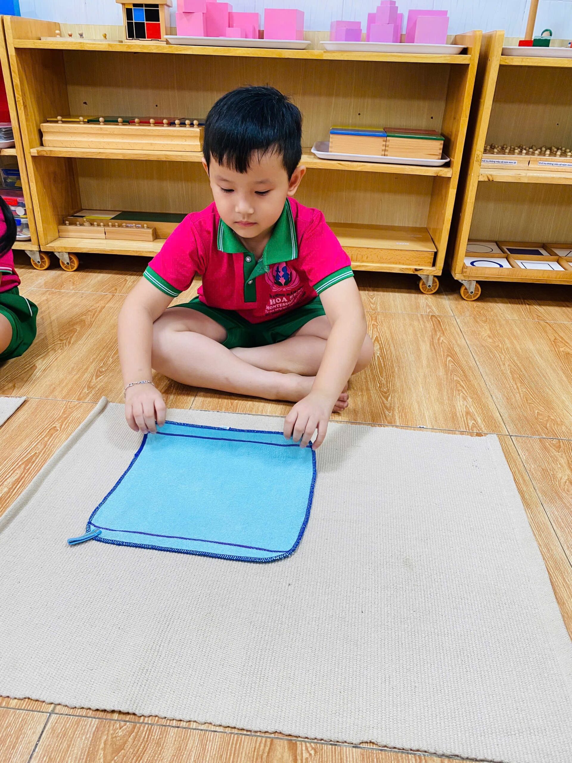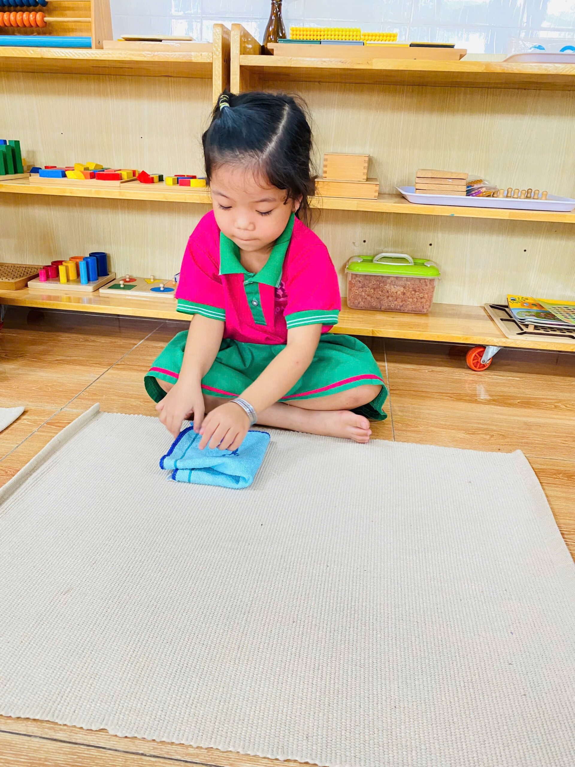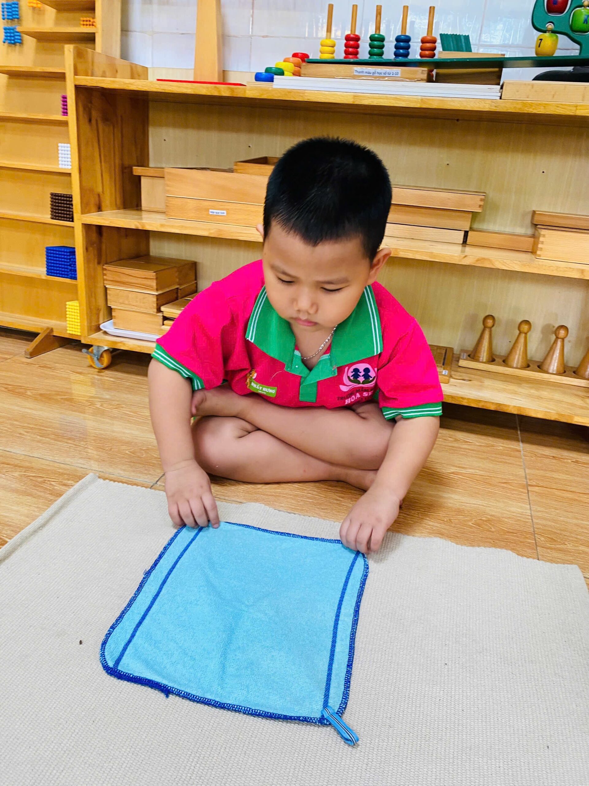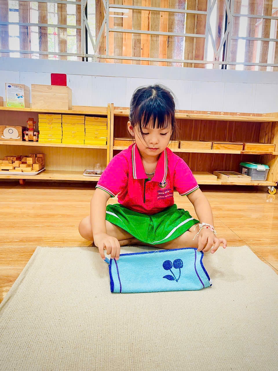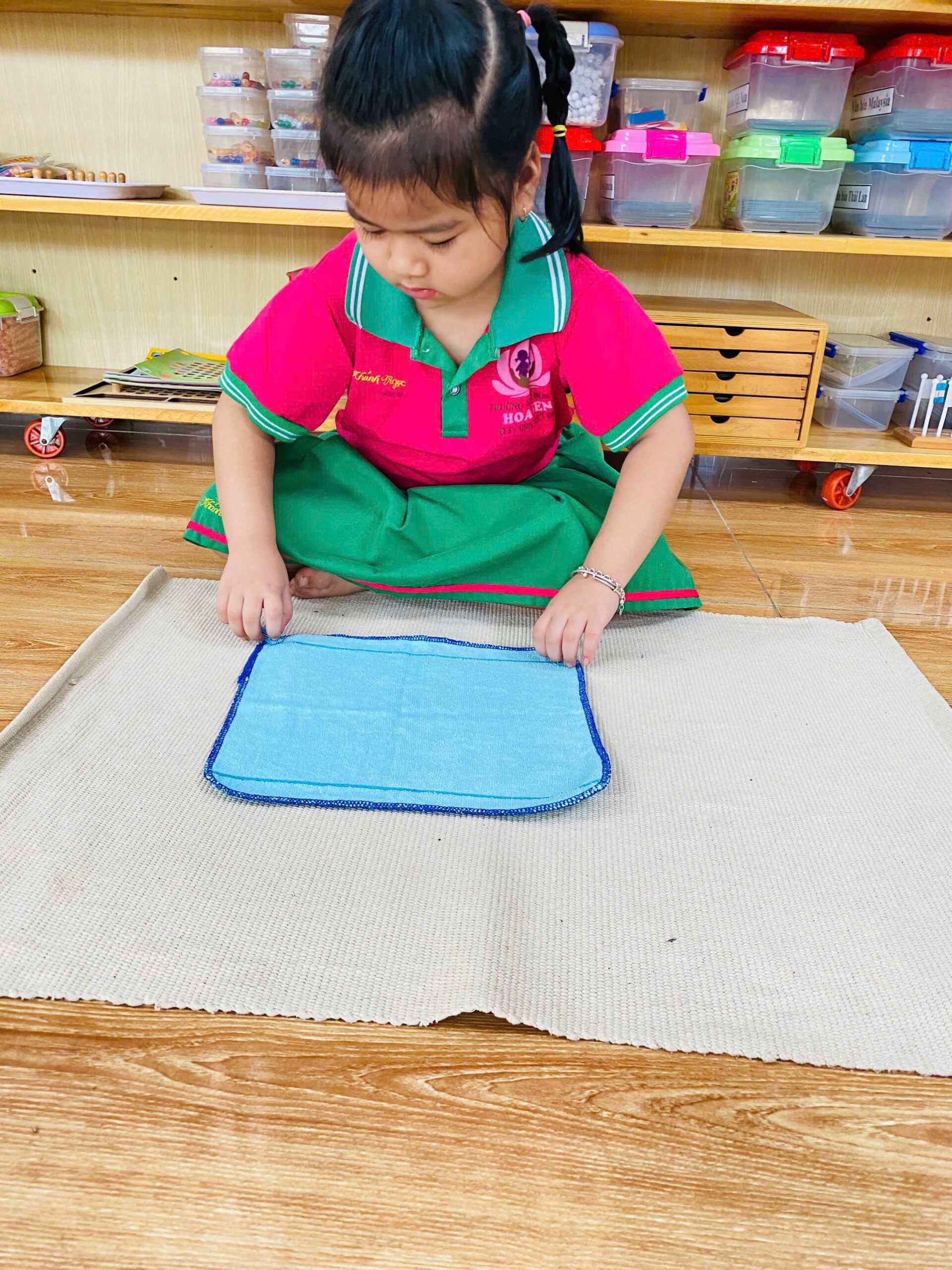 Hôm nay, các bạn nhỏ được trải nghiệm một hoạt động vô cùng thú vị trong tiết học Montessori – kỹ năng trải và gấp khăn 🧺✨