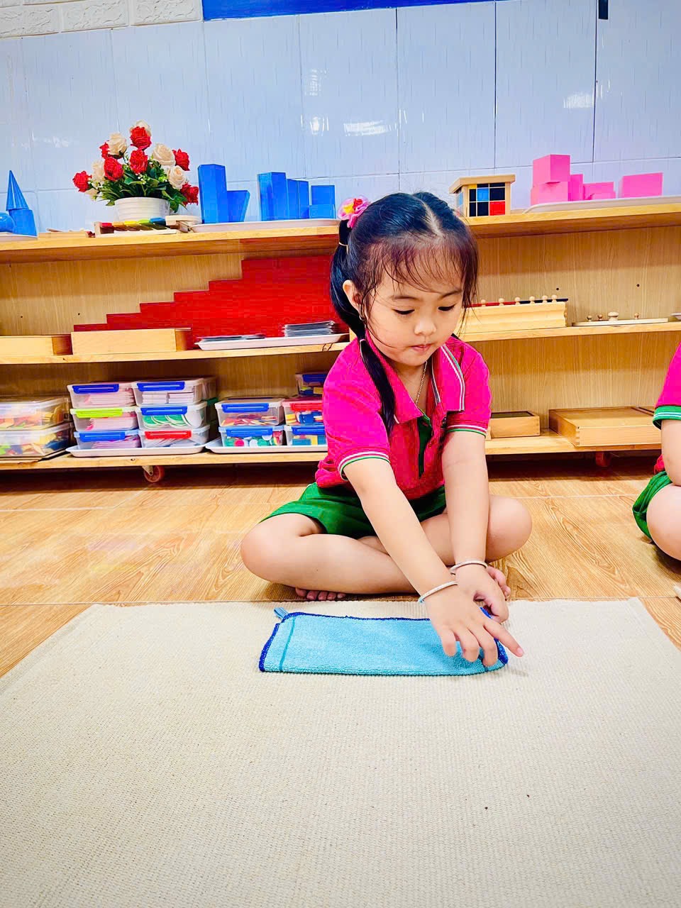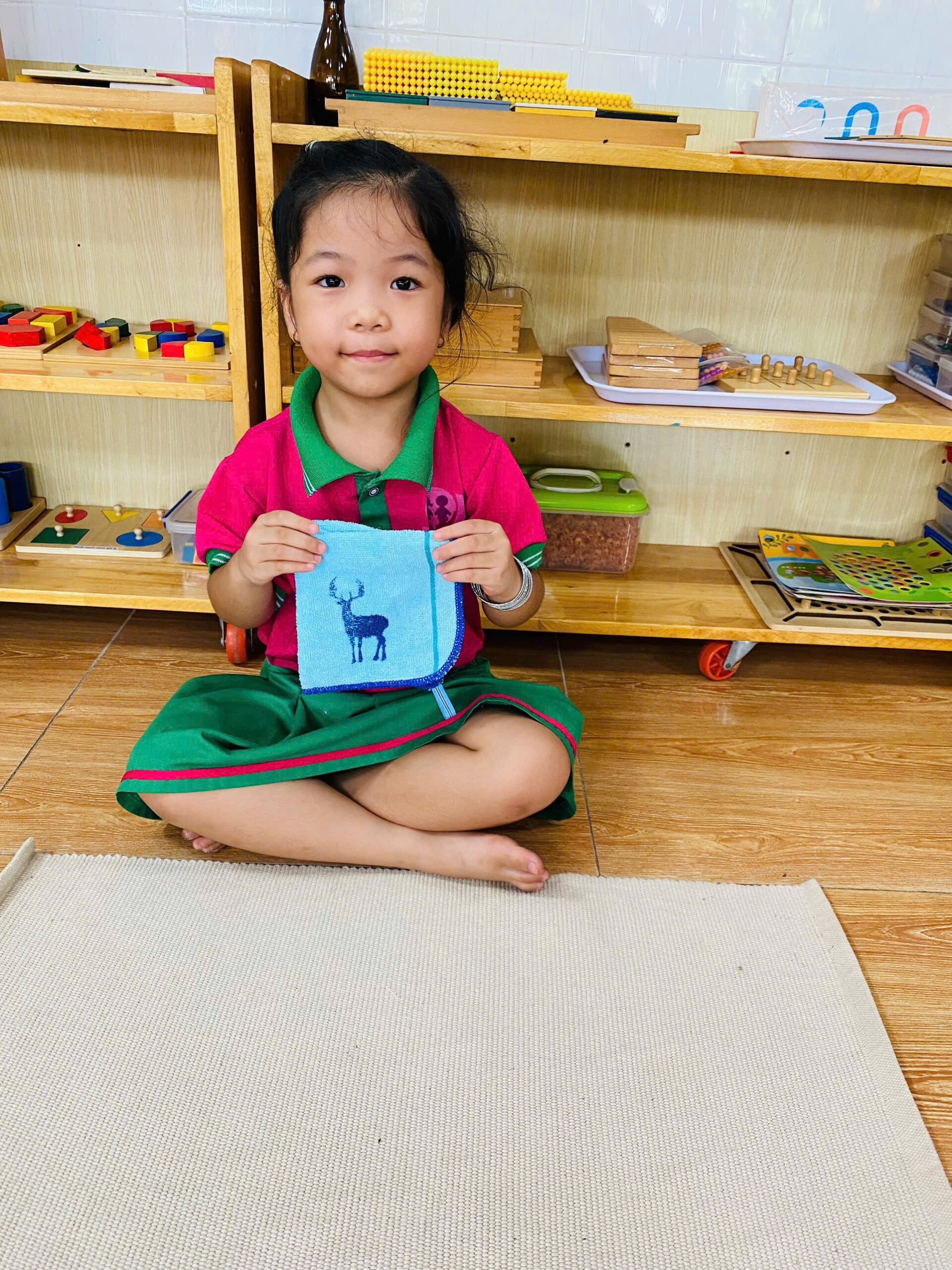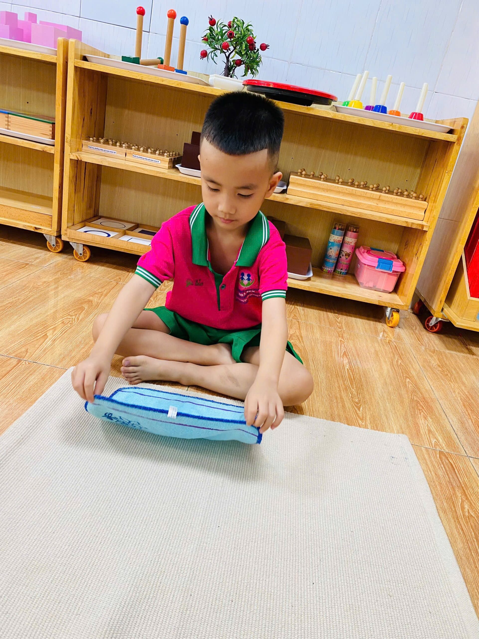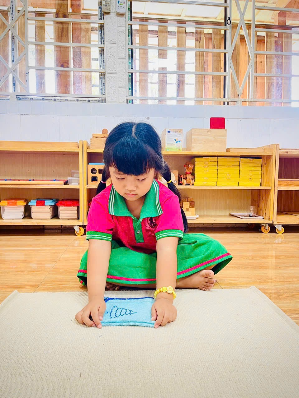 Hôm nay, các bạn nhỏ được trải nghiệm một hoạt động vô cùng thú vị trong tiết học Montessori – kỹ năng trải và gấp khăn 🧺✨