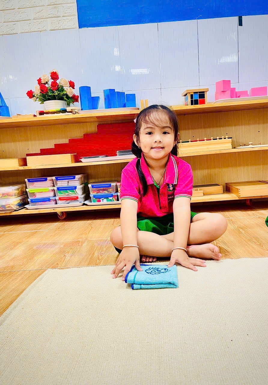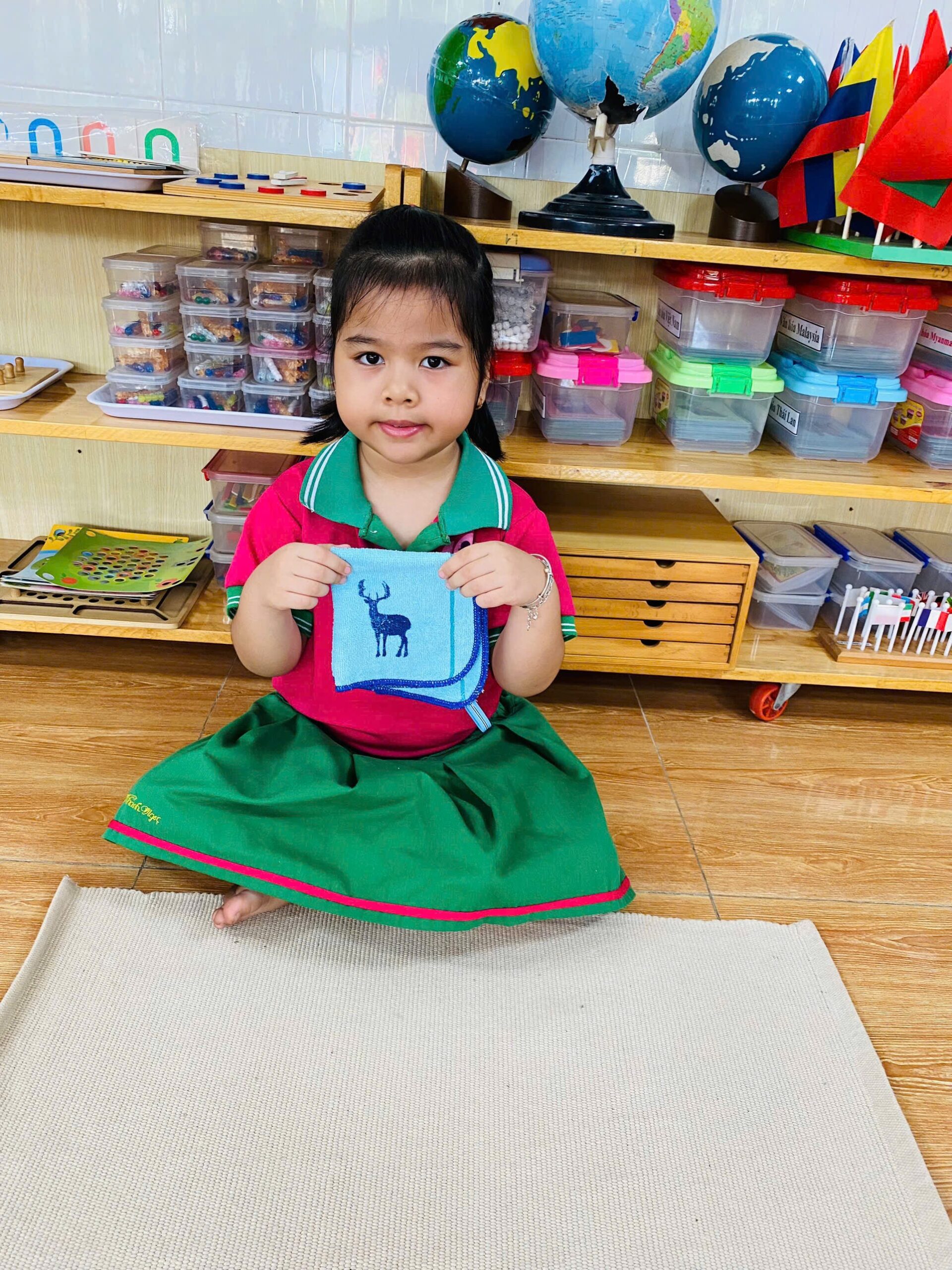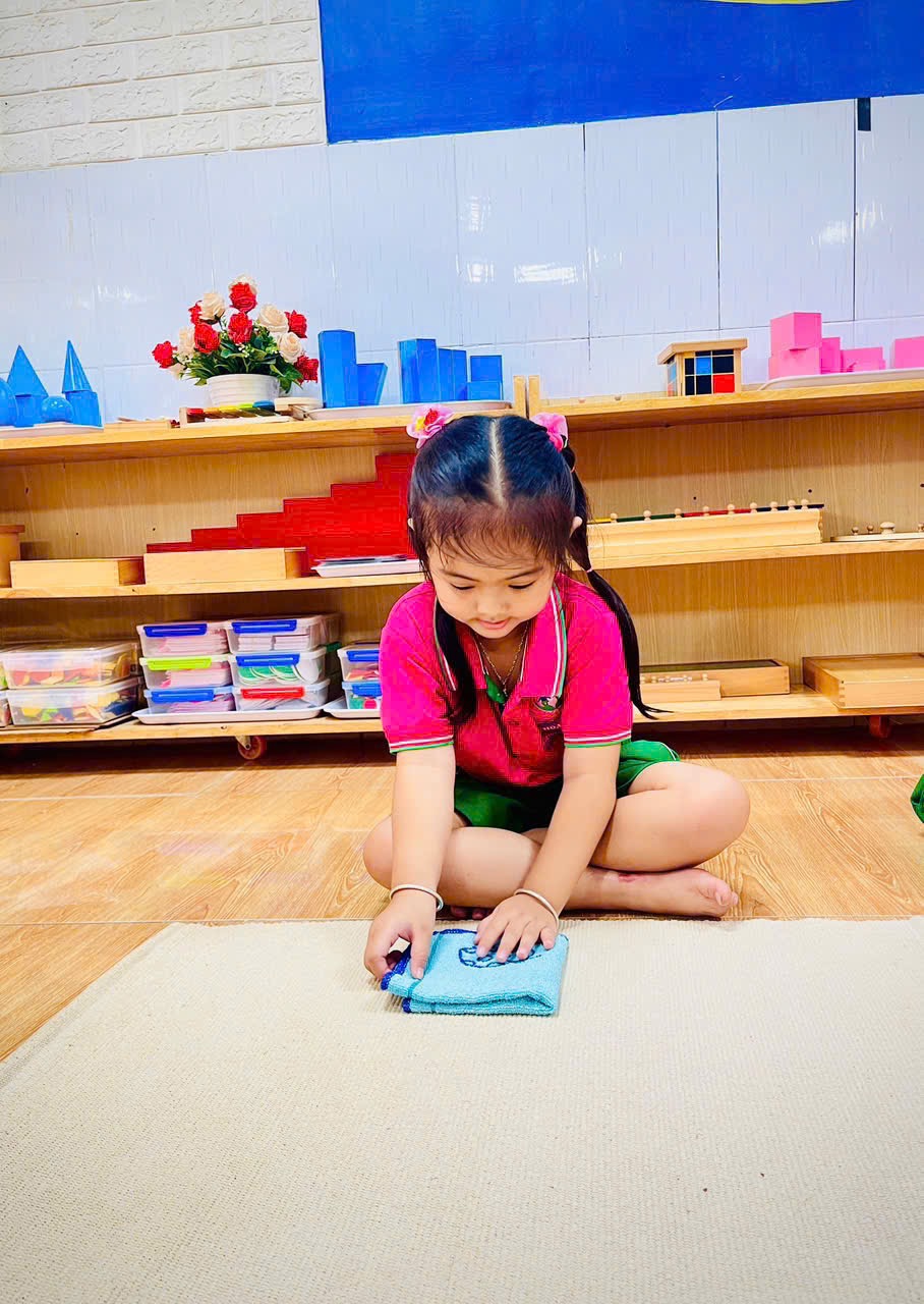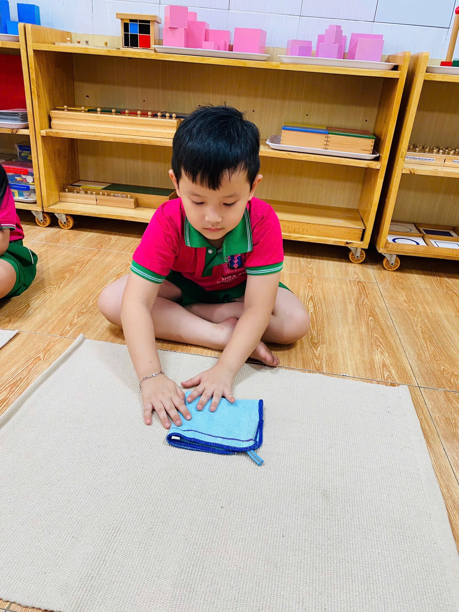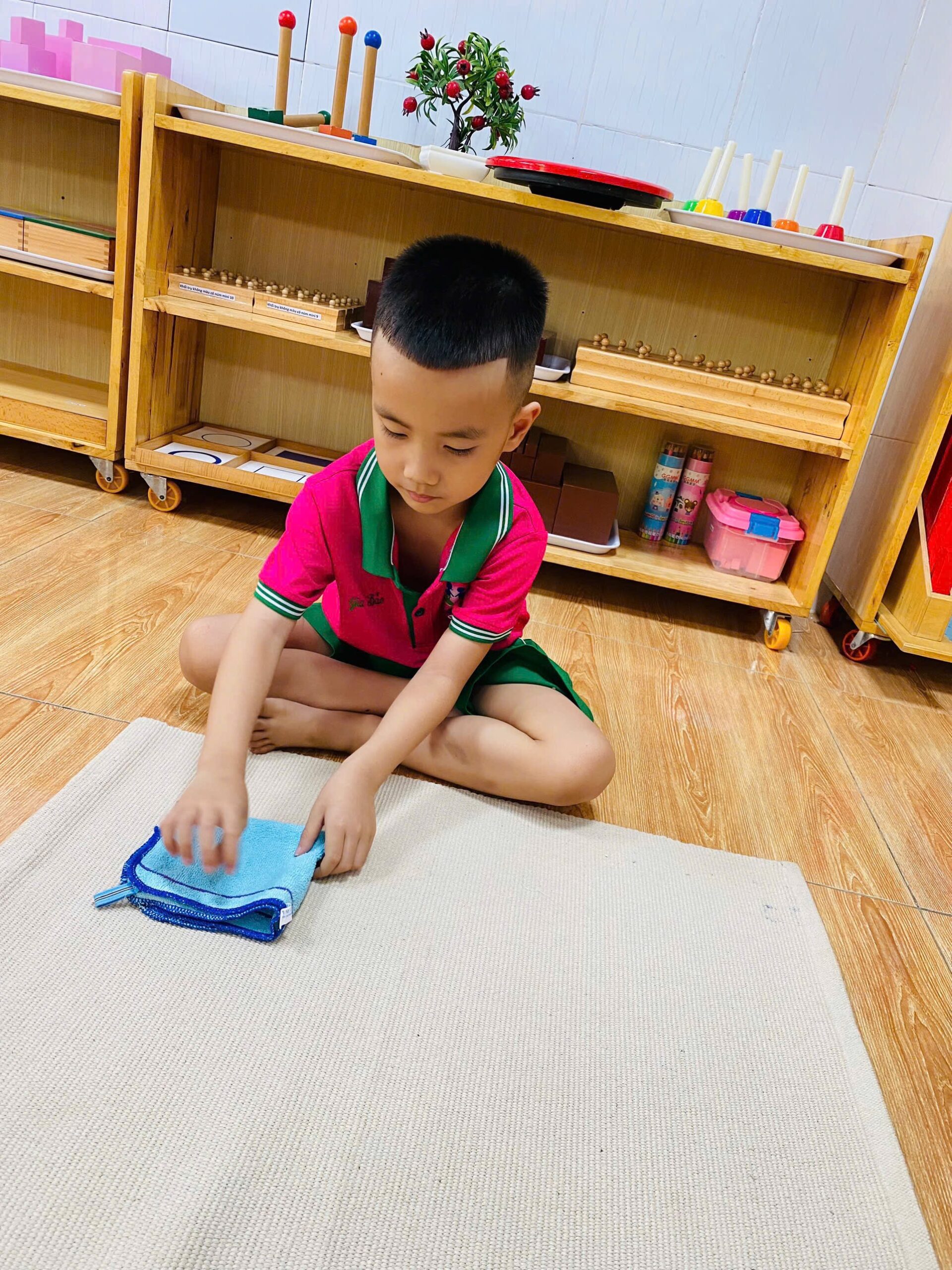 Hôm nay, các bạn nhỏ được trải nghiệm một hoạt động vô cùng thú vị trong tiết học Montessori – kỹ năng trải và gấp khăn 🧺✨
