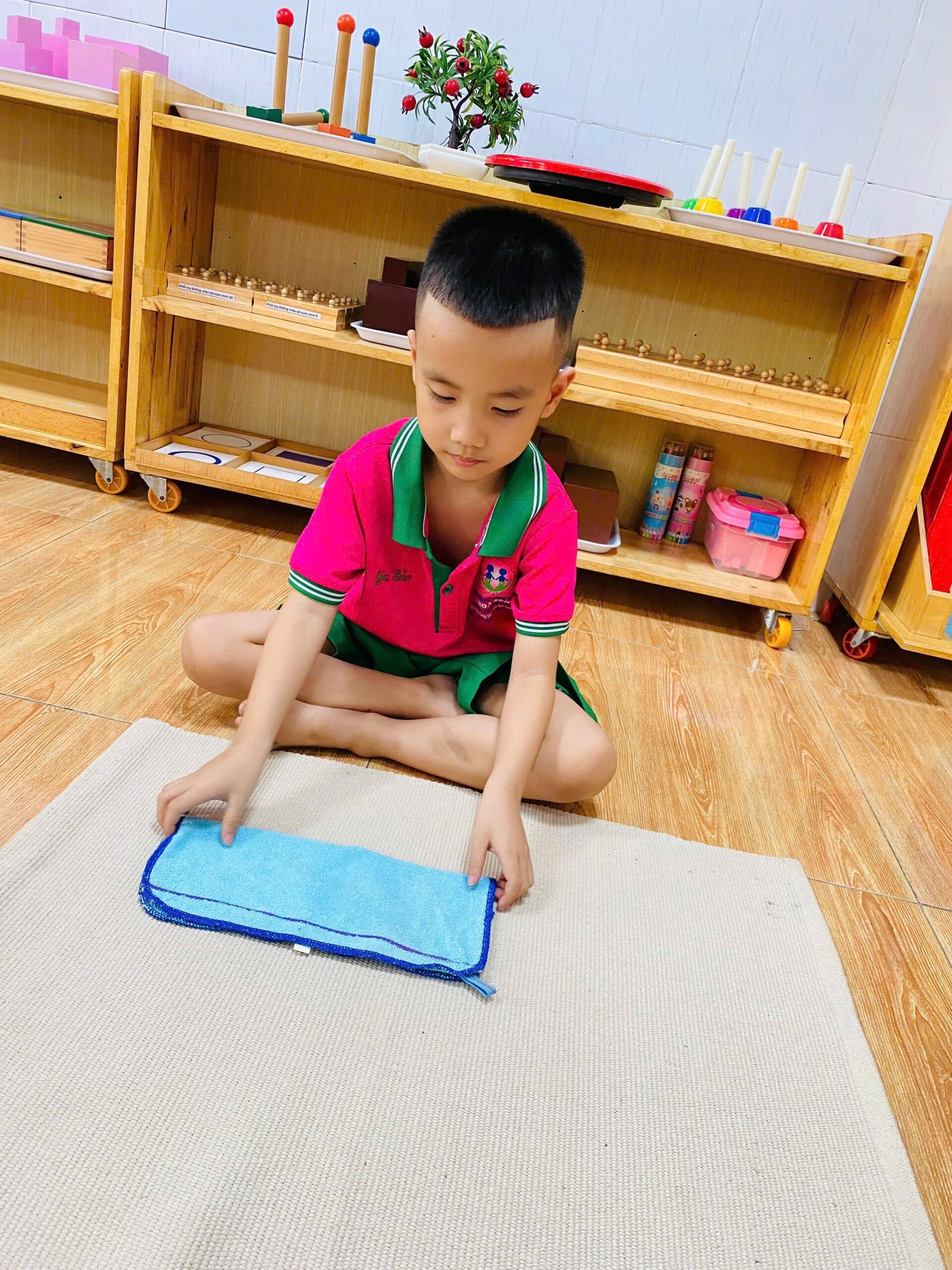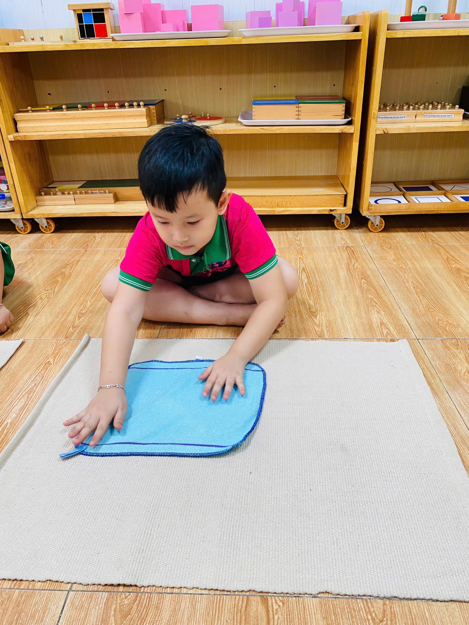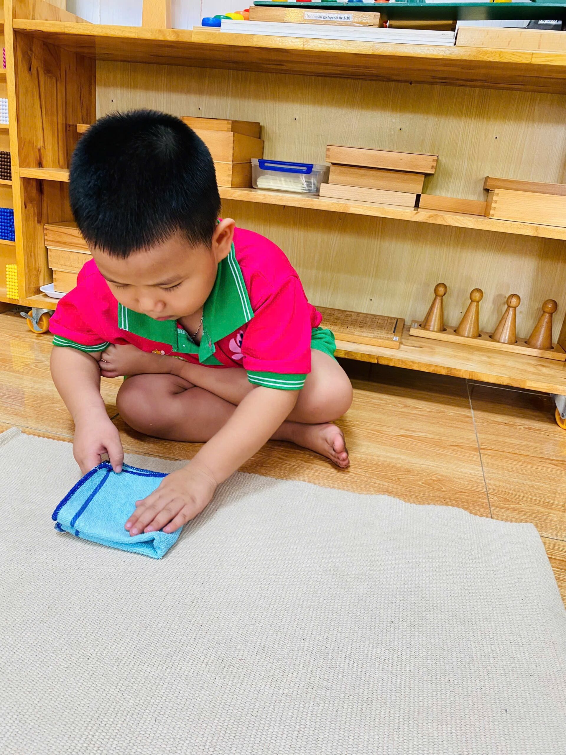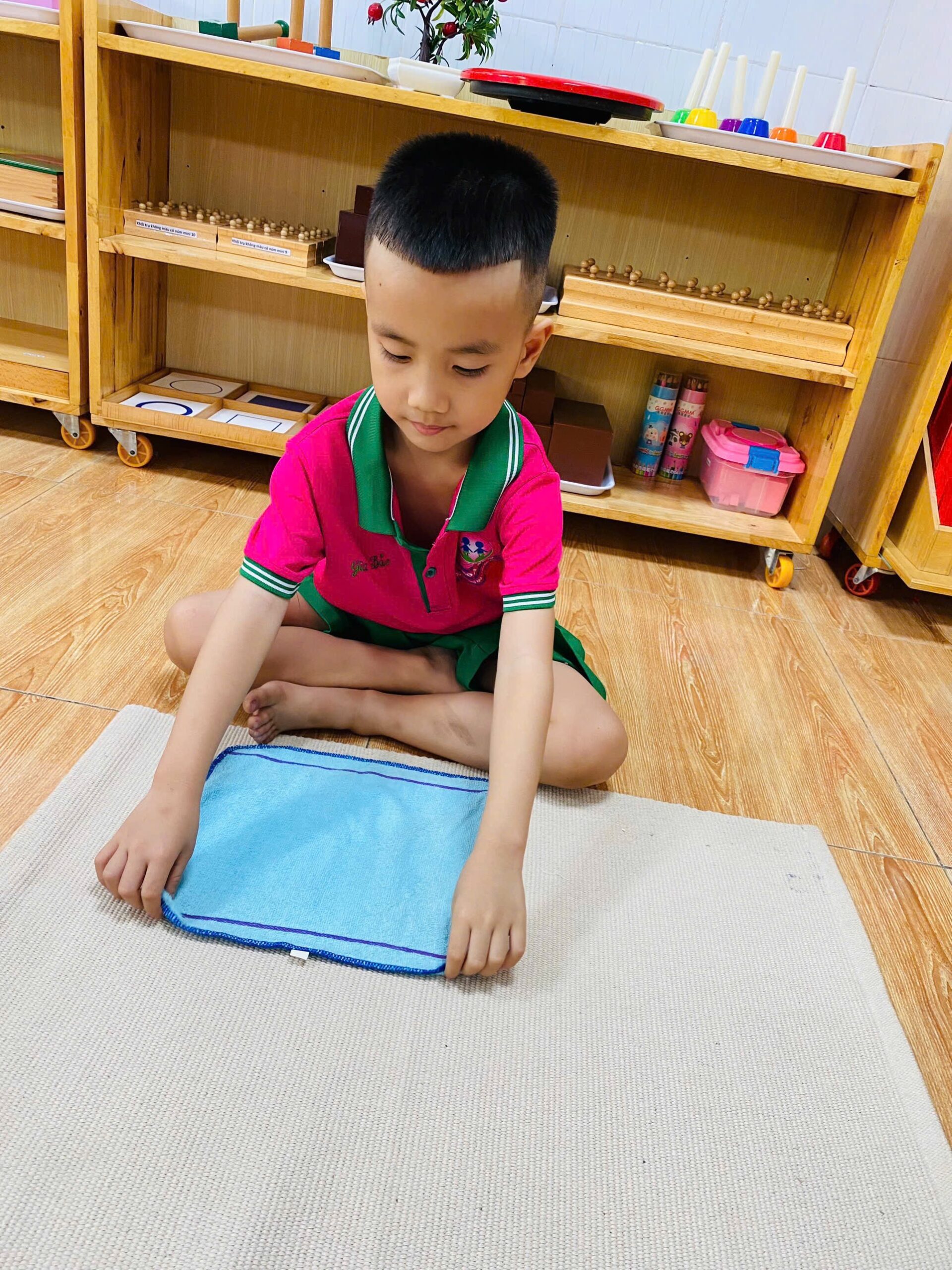 Giờ học Montessori – Bé tập trải và gấp khăn