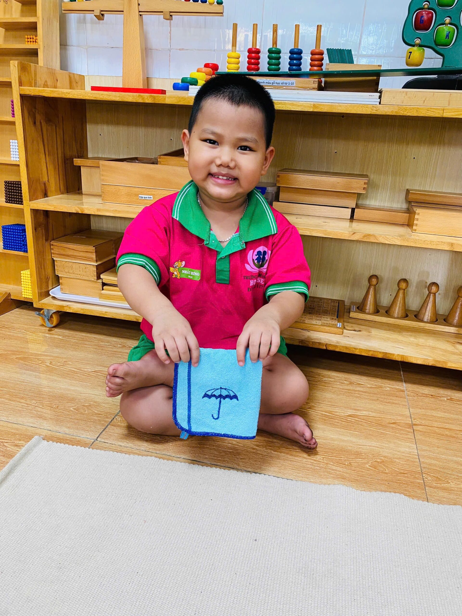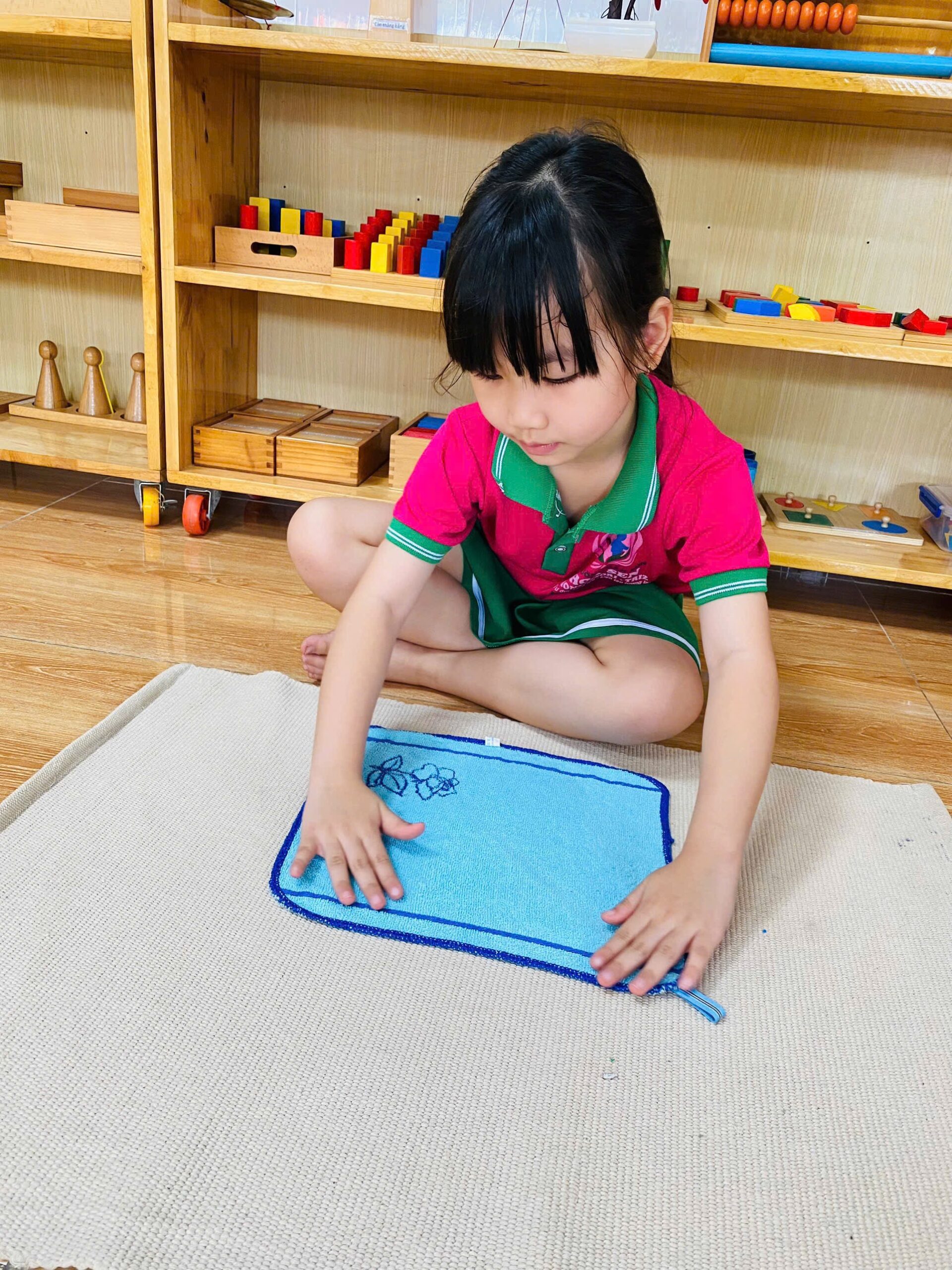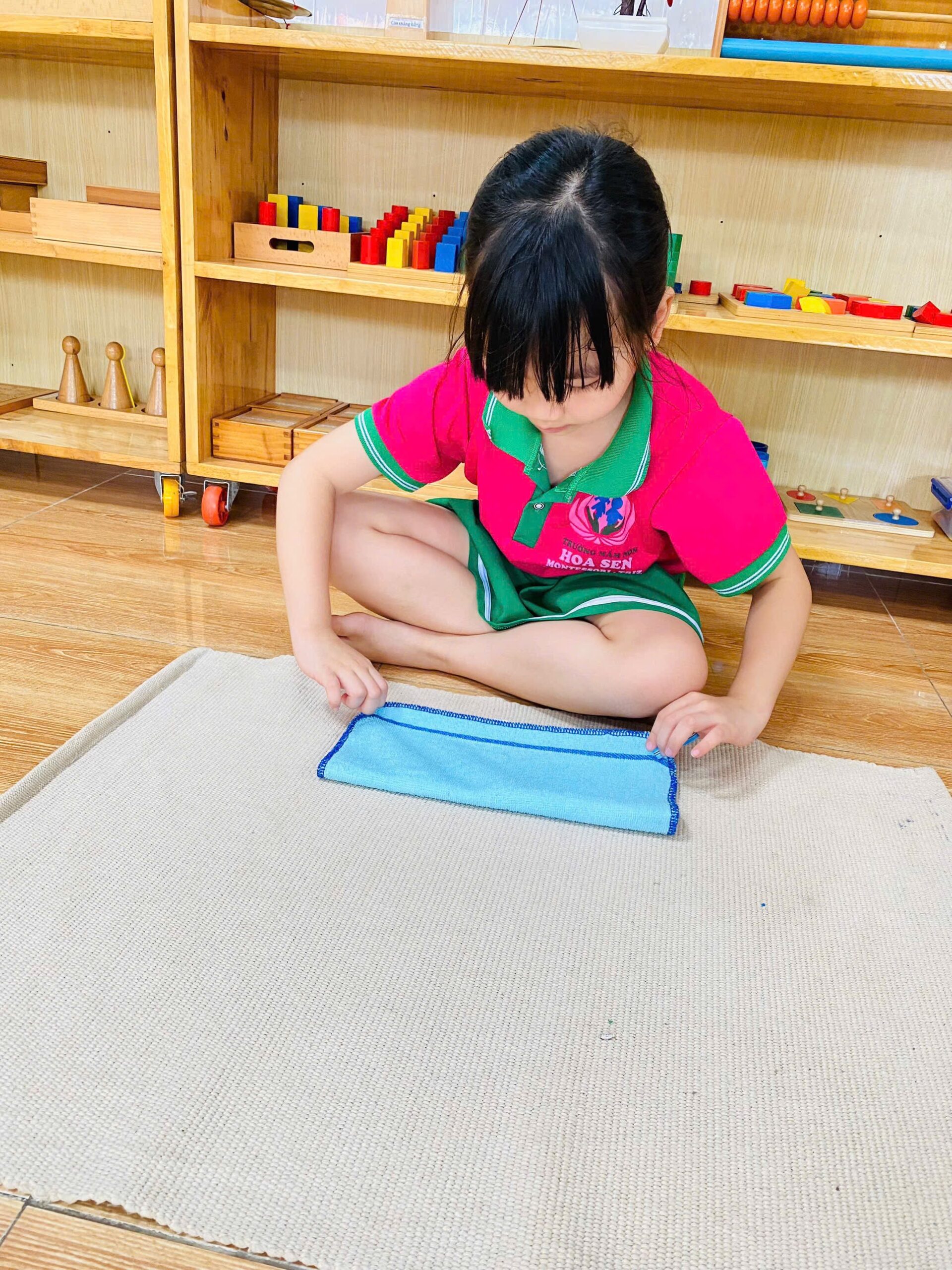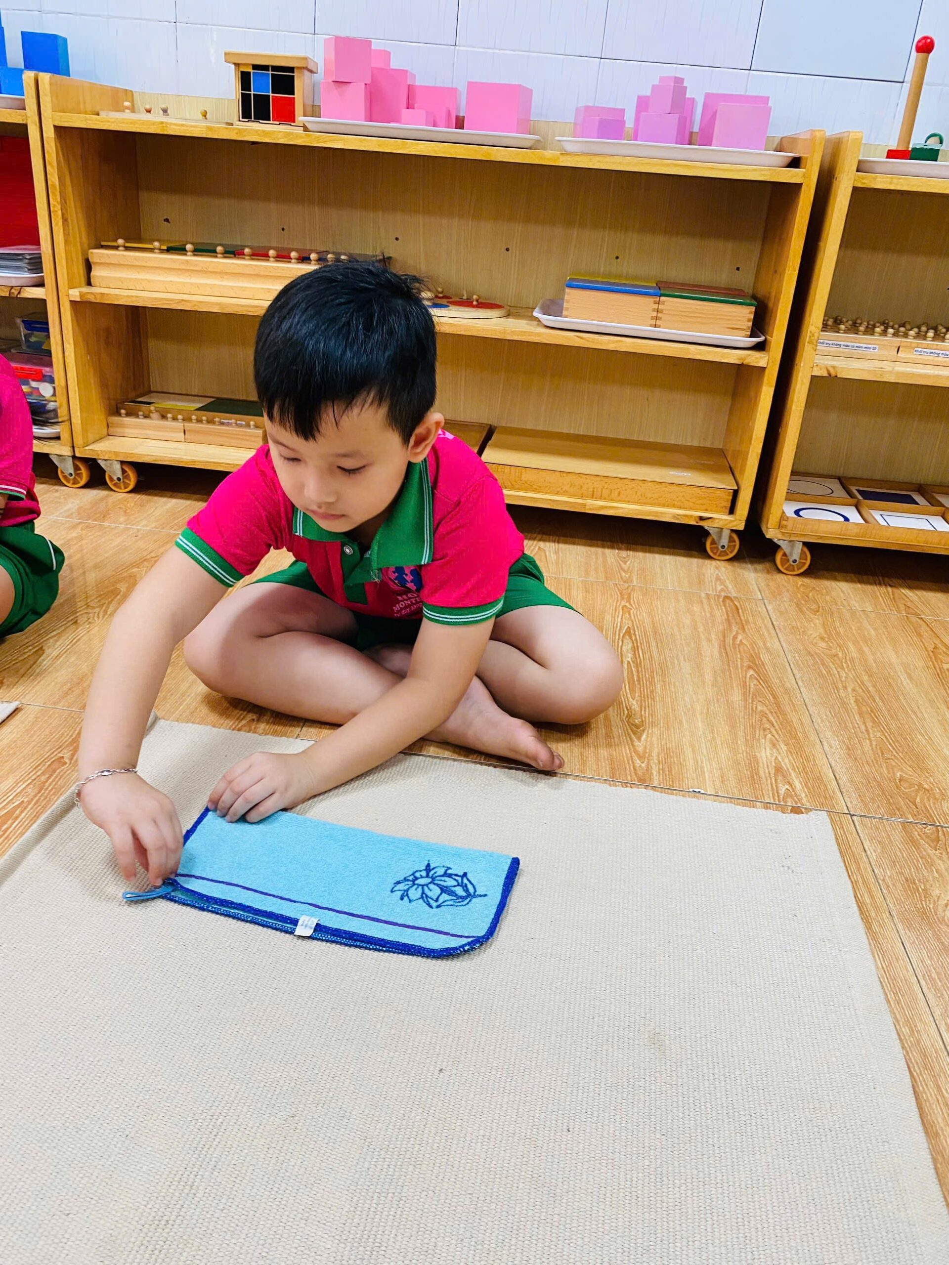 Giờ học Montessori – Bé tập trải và gấp khăn