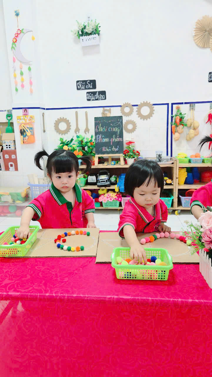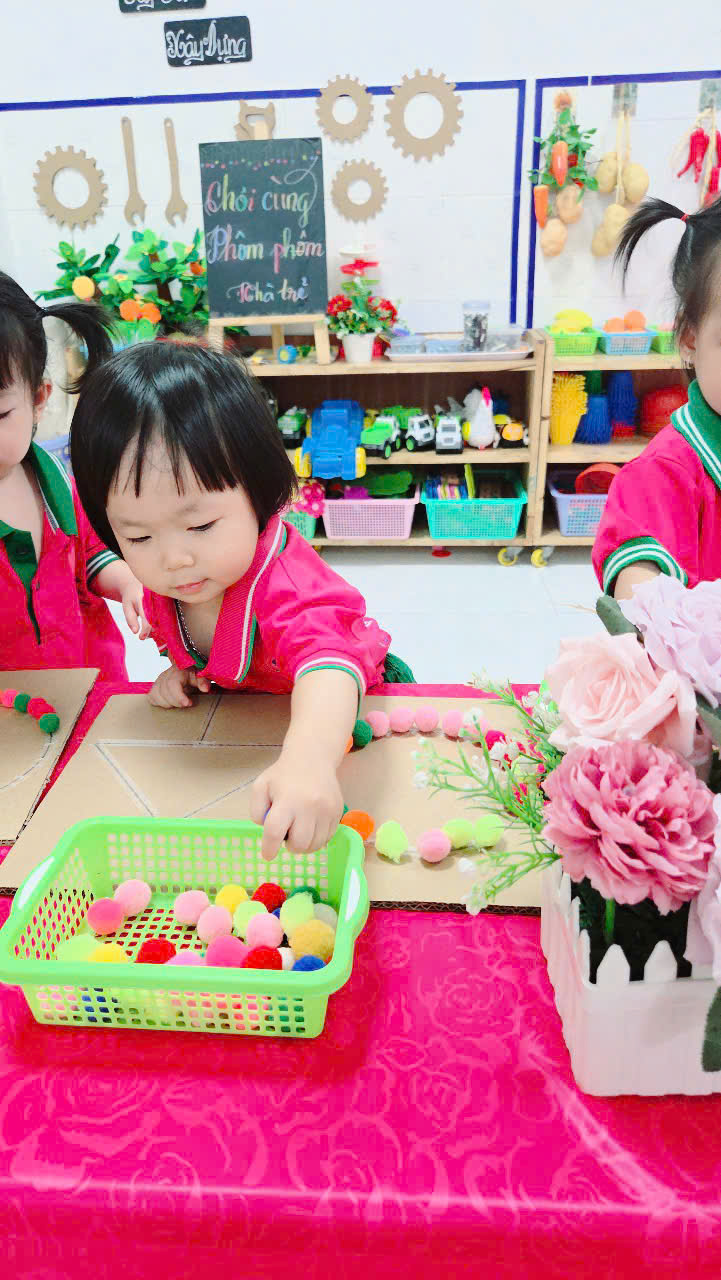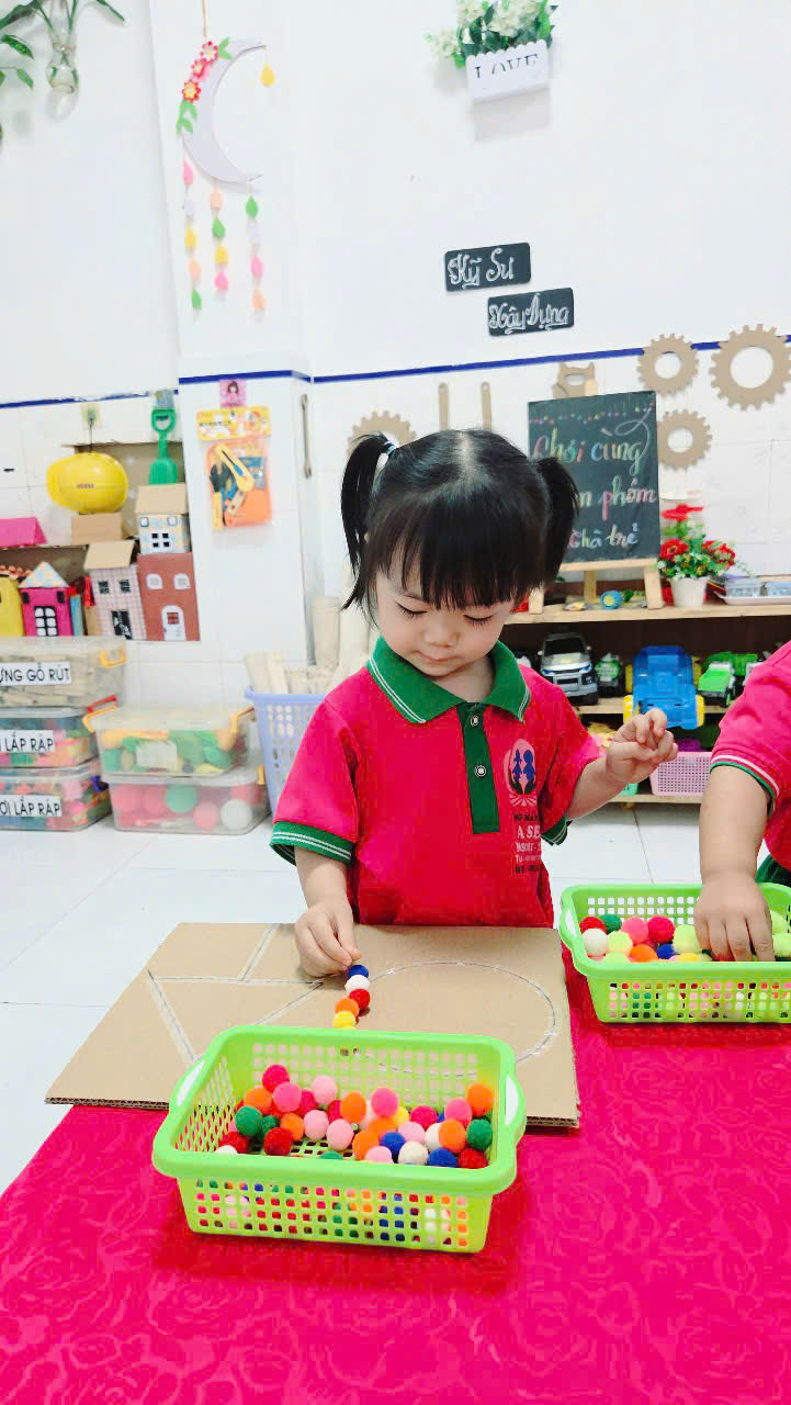 Hôm nay, các bạn nhỏ lớp nhà trẻ tại Mầm non Hoa Sen Montessori – Triz đã có một buổi học thật vui với những quả pom pom nhiều màu sắc🧶✨