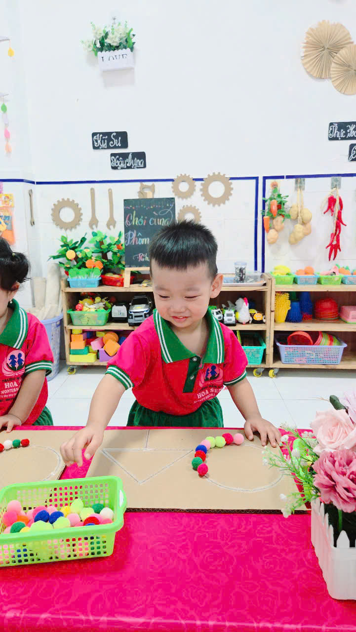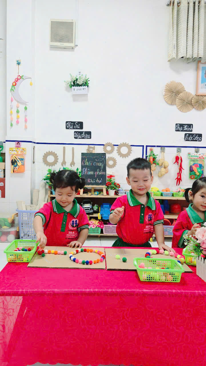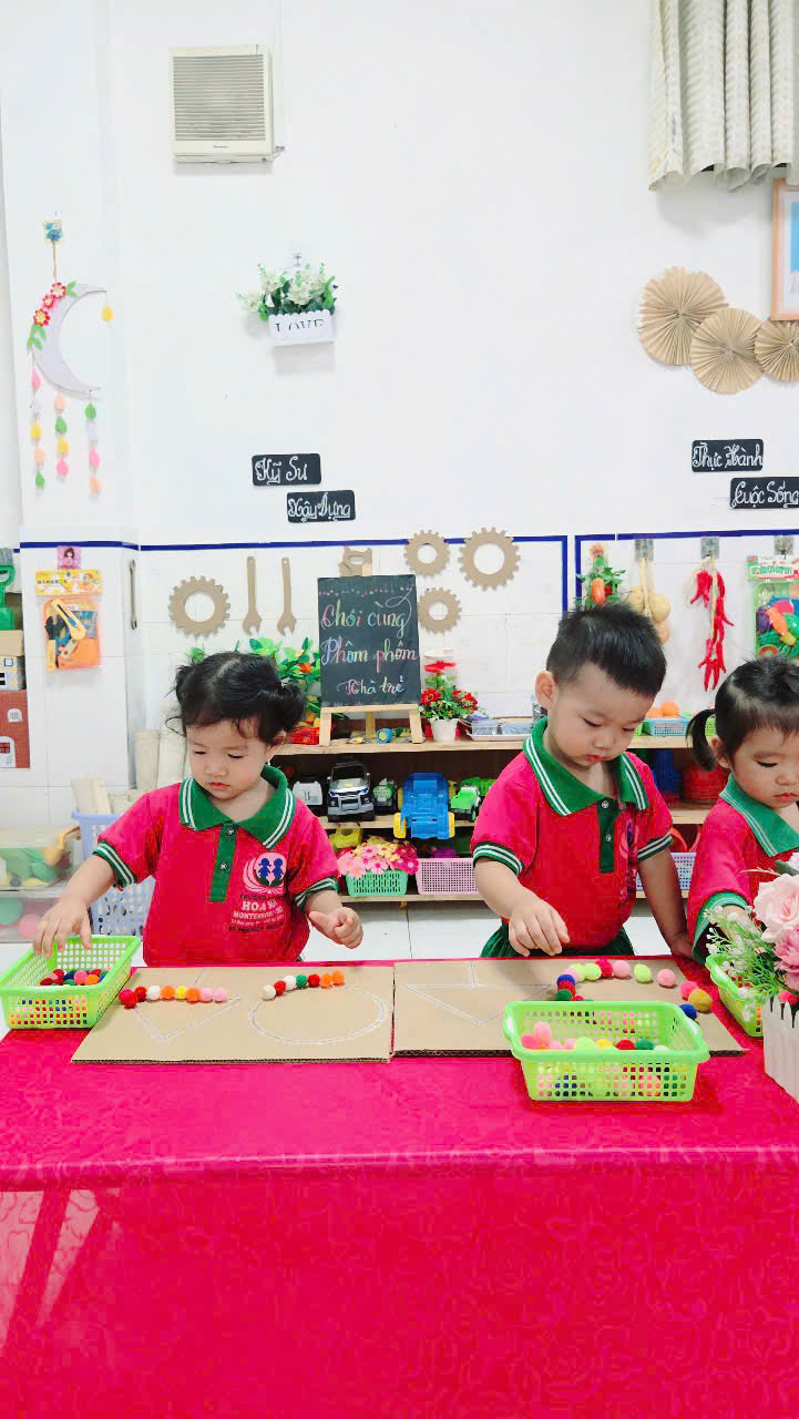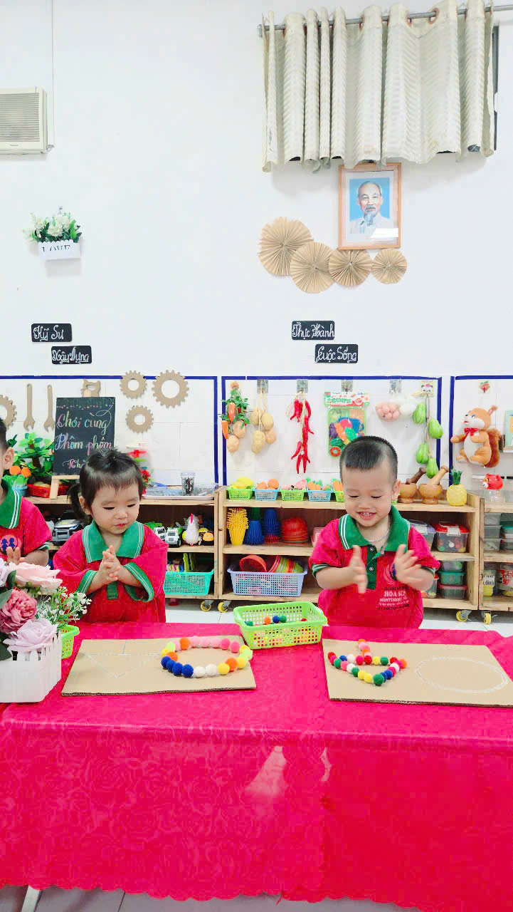 Hôm nay, các bạn nhỏ lớp nhà trẻ tại Mầm non Hoa Sen Montessori – Triz đã có một buổi học thật vui với những quả pom pom nhiều màu sắc🧶✨