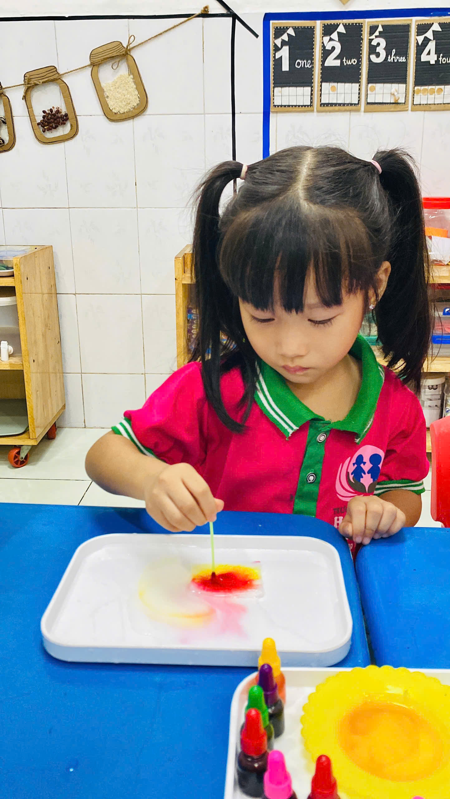 Bằng việc sử dụng các nguyên liệu gần gũi như nước, dầu ăn, màu nước và mẫu giấy nhỏ, các bạn nhỏ đã được tận mắt chứng kiến những tia màu loang ra trong nước như những bông pháo hoa rực rỡ. Một trải nghiệm thật kỳ diệu mà vẫn an toàn và dễ thực hiện! 🌟