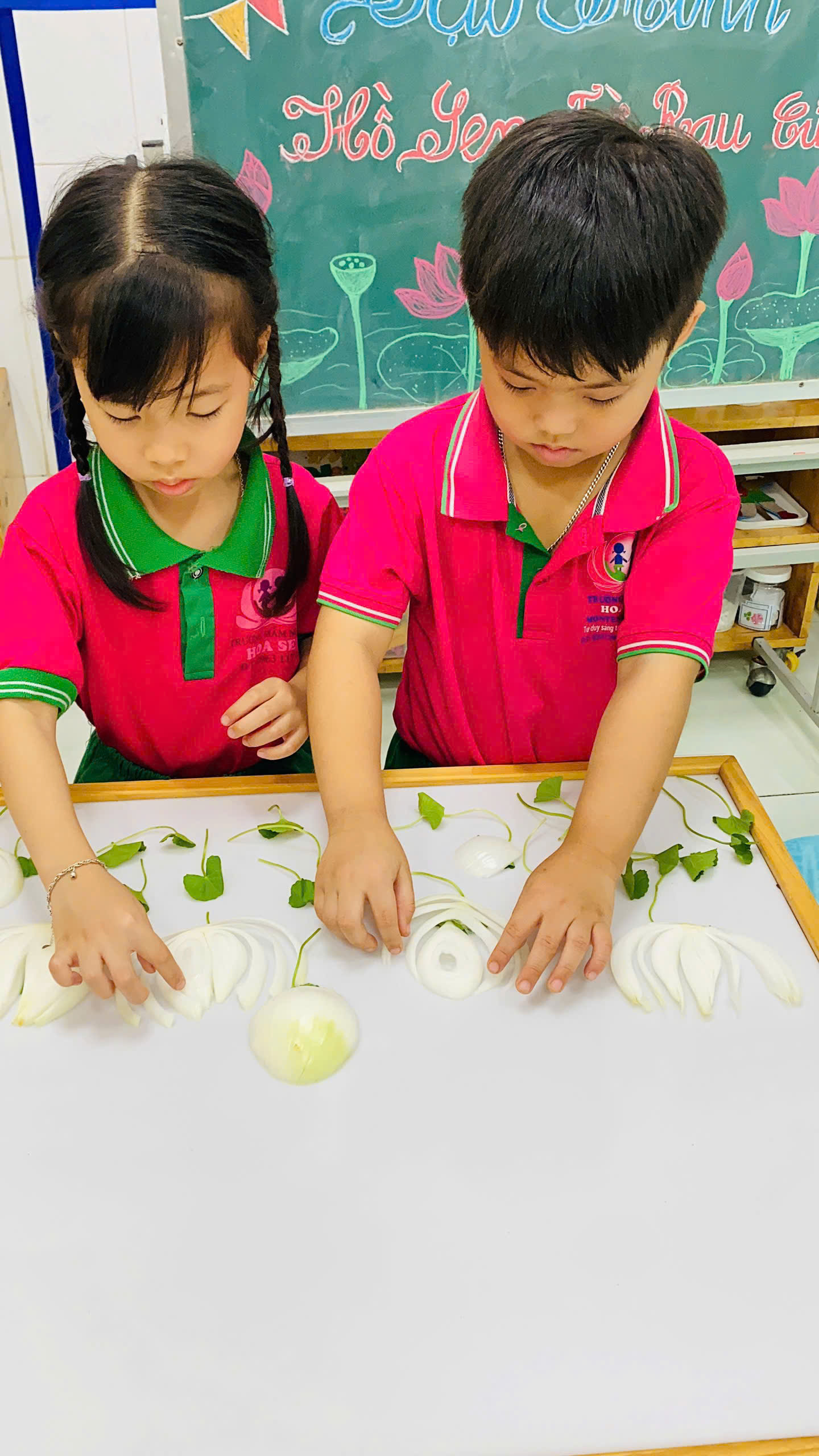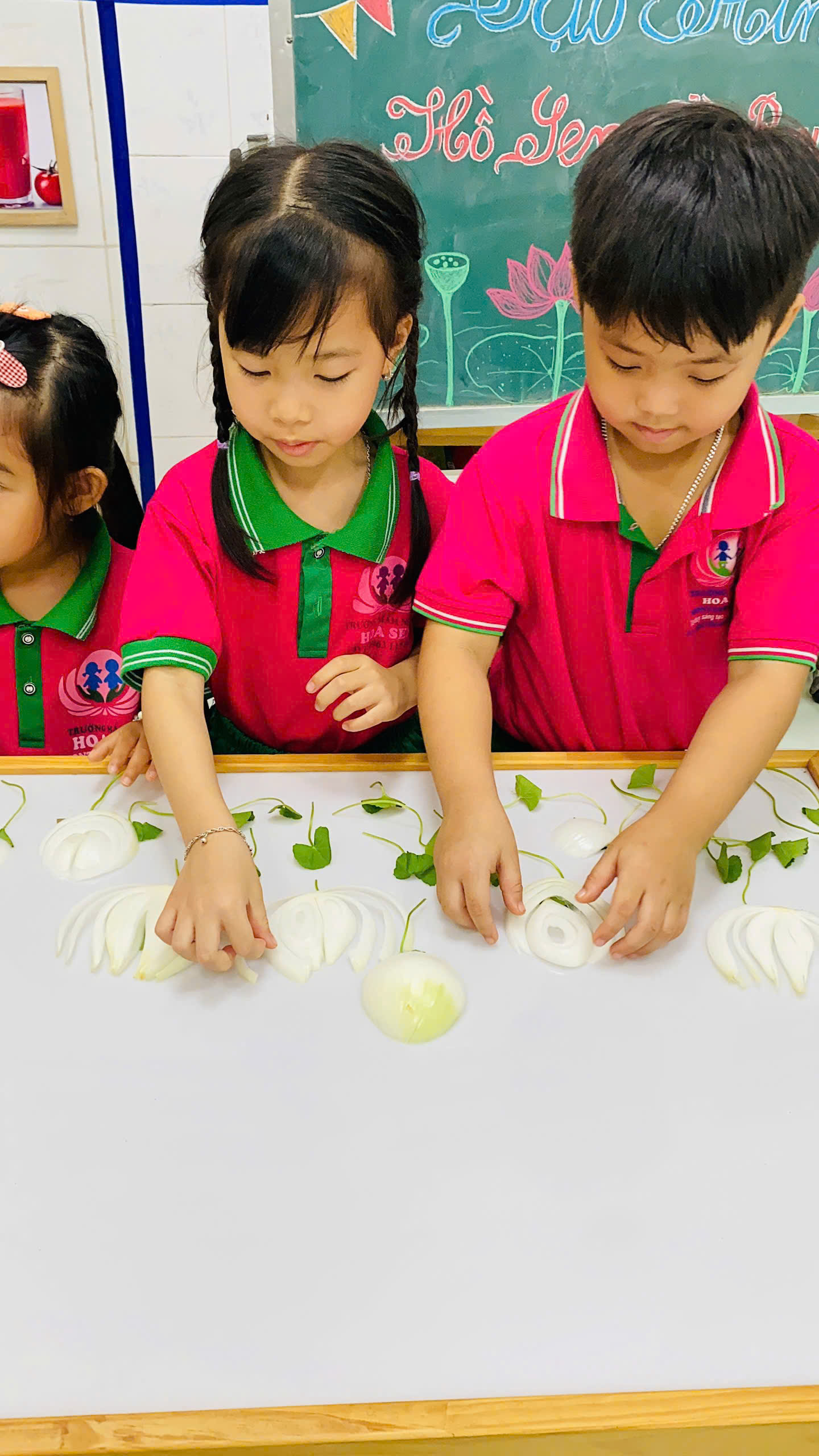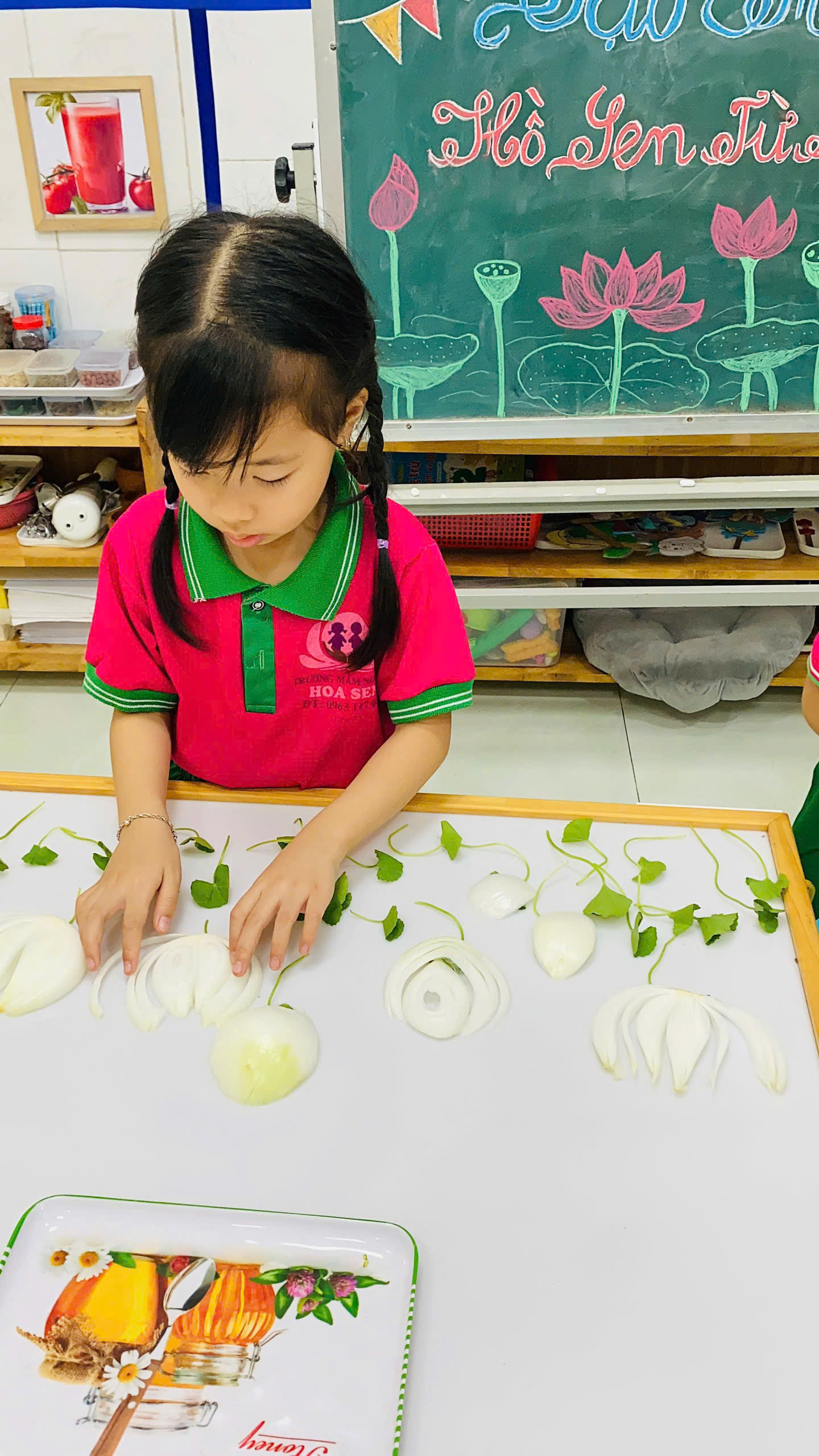 Hôm nay, các bạn nhỏ lớp Lá 1 đã có một tiết học tạo hình sáng tạo và gần gũi với thiên nhiên qua hoạt động “Tạo hồ sen từ rau củ”. Điều đặc biệt là nguyên liệu không phải giấy hay màu, mà chính là củ hành tây và rau má – những món quen thuộc trong gian bếp hằng ngày! 🧅🌱