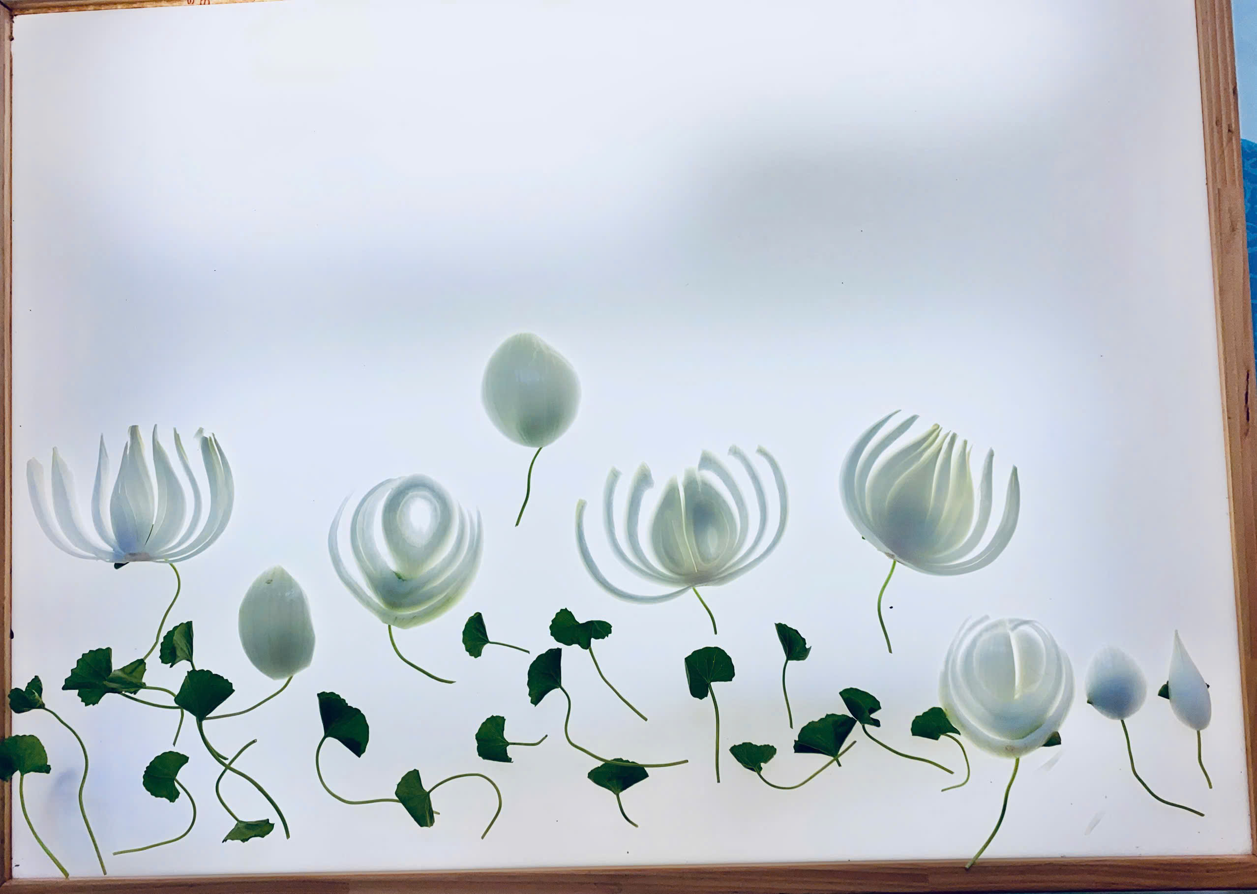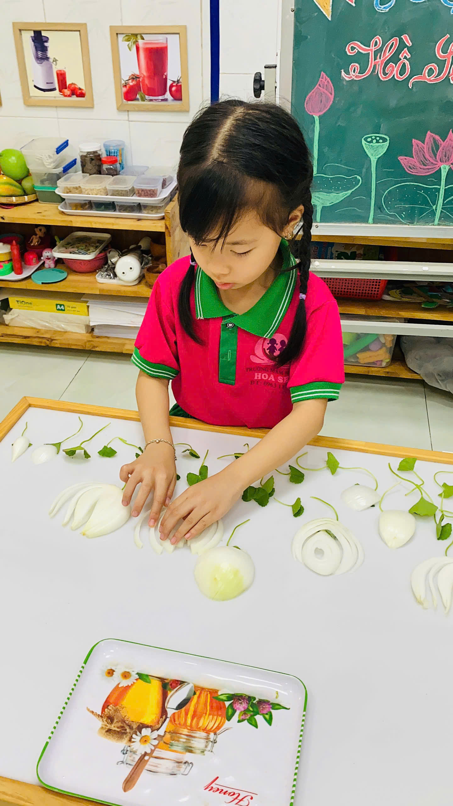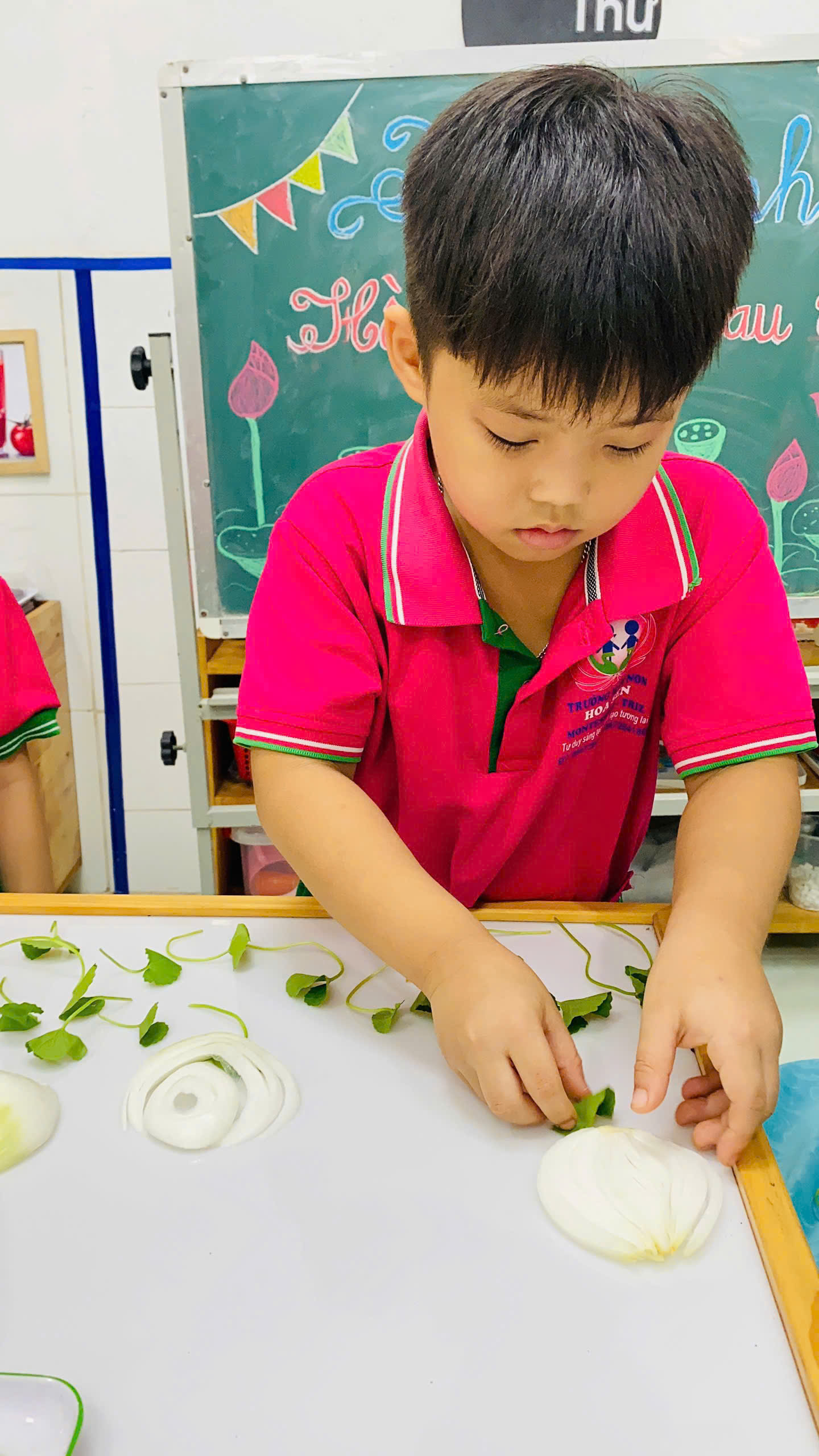 Hôm nay, các bạn nhỏ lớp Lá 1 đã có một tiết học tạo hình sáng tạo và gần gũi với thiên nhiên qua hoạt động “Tạo hồ sen từ rau củ”. Điều đặc biệt là nguyên liệu không phải giấy hay màu, mà chính là củ hành tây và rau má – những món quen thuộc trong gian bếp hằng ngày! 🧅🌱
